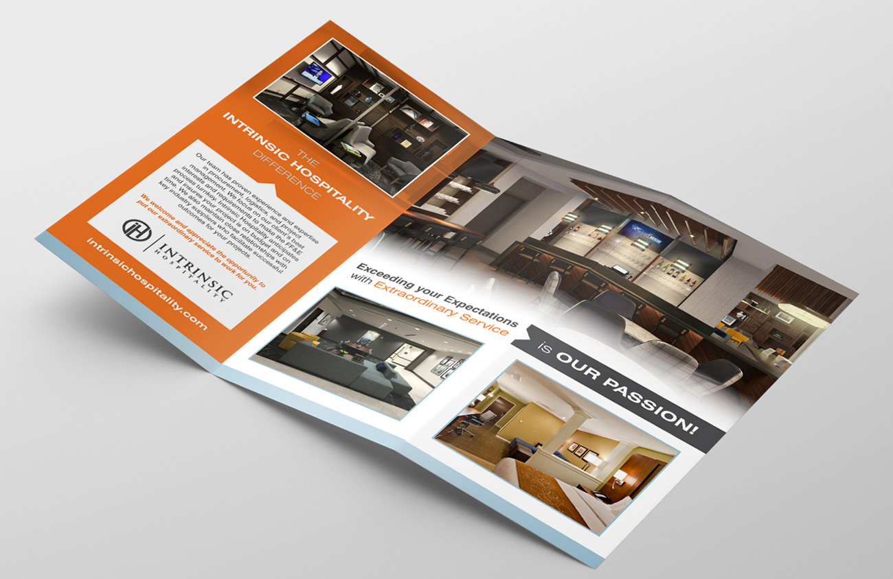 Compass Creative developed this brochure for Intrinsic Hospitality, an interior design firm, to promote their services to their business customers. We redesigned their logo and coordinated the photo shoot for the project so that they could be more professional when visiting customers.