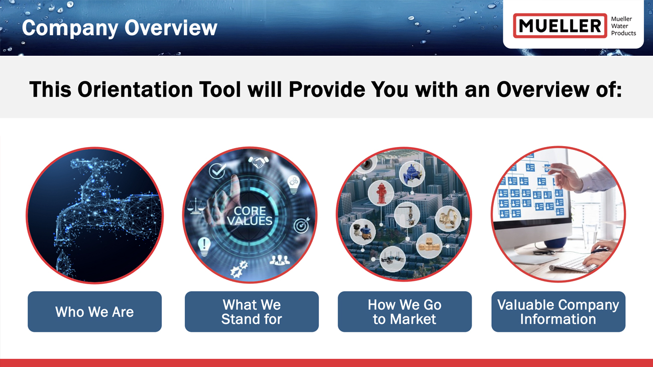 Mueller Water Products hired us to design and develop presentations and videos to be used in training their new employees. We developed all of the content from the outline to the final products for the presentations and videos. We also did all the scriptwriting, narration recording, and editing for all the videos.