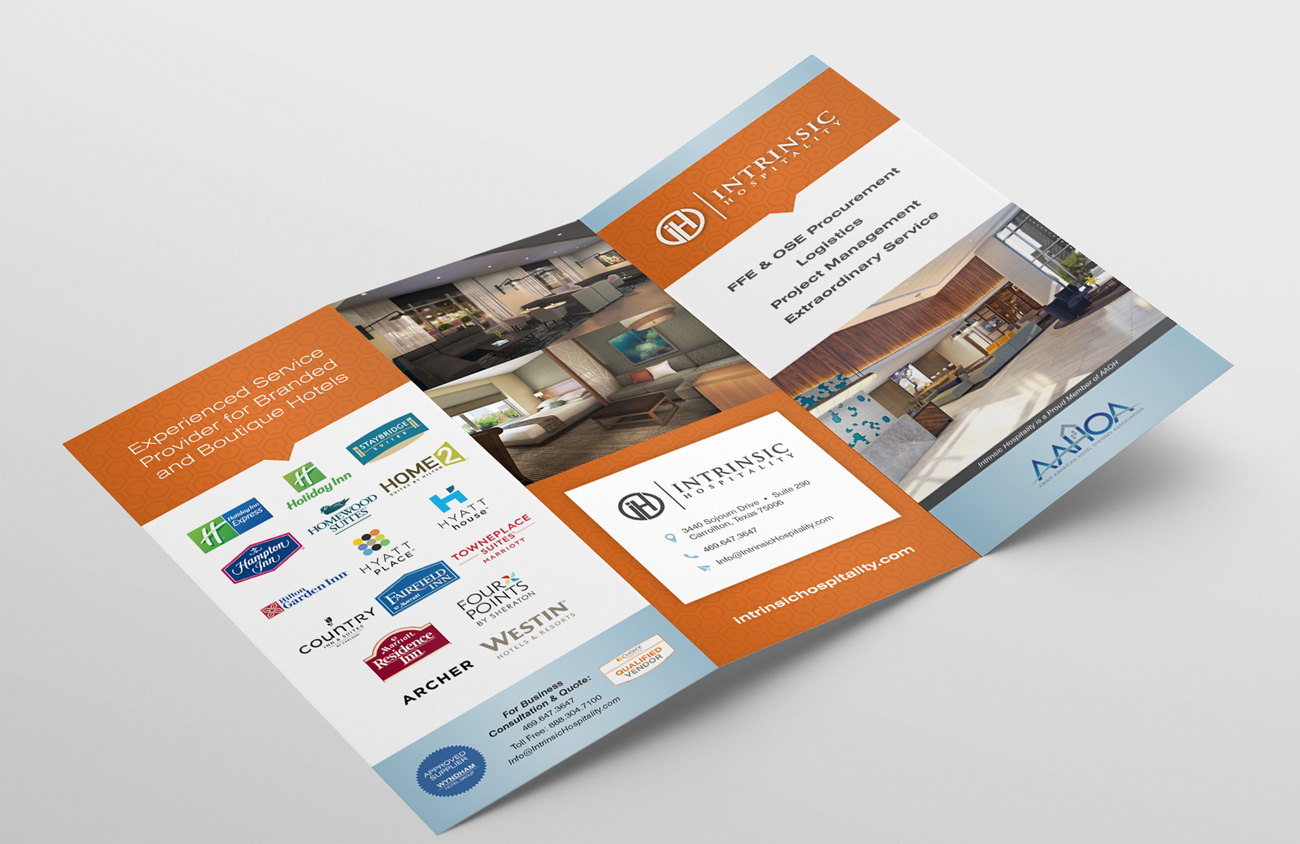 Compass Creative developed this brochure for Intrinsic Hospitality, an interior design firm, to promote their services to their business customers. We redesigned their logo and coordinated the photo shoot for the project so that they could be more professional when visiting customers.