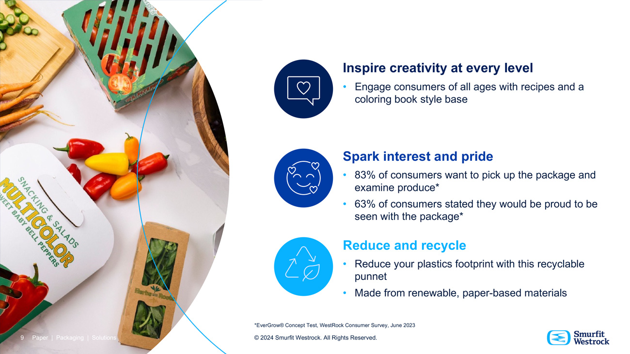 Smurfit Westrock is a global leader in packaging products and design for products ranging from high-end beauty, electronics, home goods, and food and beverage. This was a product marketing presentation for a new moisture-resistant packaging for food products. The colors, format, and imagery were designed to communicate freshness and innovation.