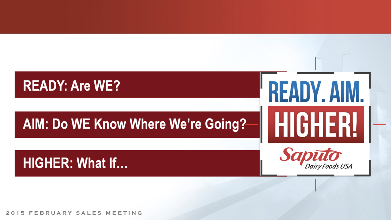 Compass Creative supported Saputo with their in-person sales meetings. We worked with each presenter to help write their scripts and storyboard their presentations. Then we create all the presentations, print materials and dynamic intro videos. We also go onsite at the events and make sure all the presentations are correct on the big screens.